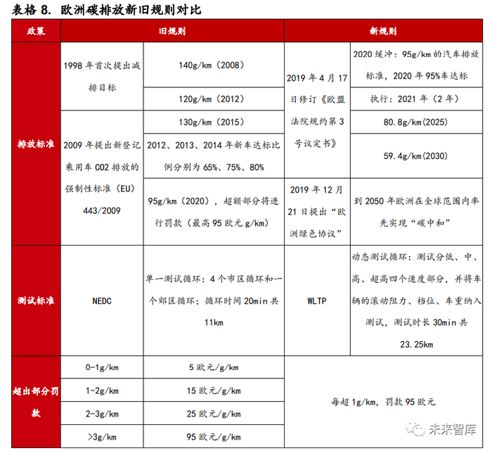 排放新规严苛,欧洲电动化趋势加速。2019 年 4 月修订《欧盟法院规约第 3 号 议定书》中规定,2021、2025、2030 年 CO2排放标准分别为 95g/km、80.8g/km、 59.4g/km,2020 年过渡期 95%达到 95g/km 的标准,每超出目标值 1g,罚款 95 欧元/辆。而在 2018 年和 2019 年欧洲实际碳排放分别为 120.4g/km 和 122.4g/km,要实现 2020 年 95g/km 的目标压力巨大。今年来欧洲新能源汽车 景气度空前是为满足节能减排所做的必要选择,随着碳排放标准越来越严苛, 欧洲电动化趋势仍将加速。
