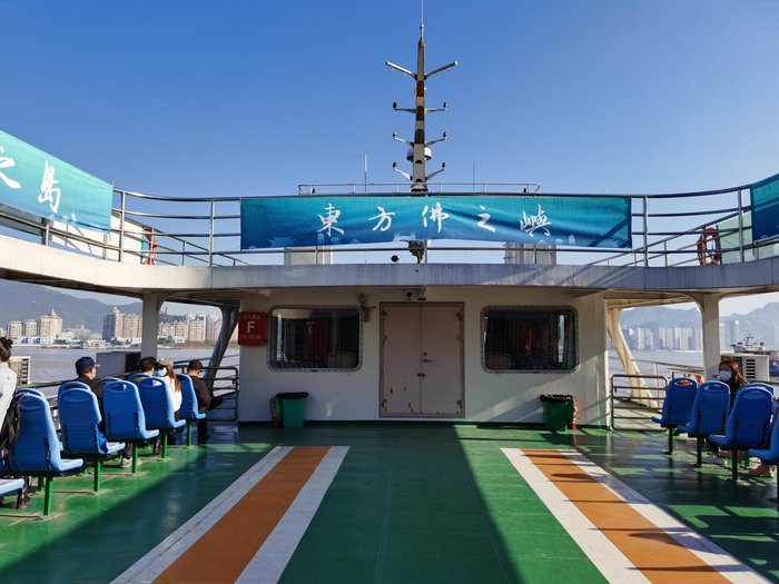 江心屿位于温州市北,瓯江中游,要在市区看好班次,依靠渡轮摆渡。航程很短,数分钟就到,渡轮也乐得朴素,一层不设座位,只在顶上安装了手拉环。二层稀疏几个露天座位,一般都是外地人拍照用。