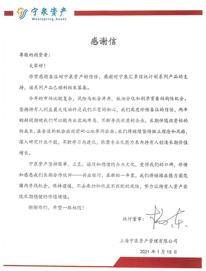 昨日,兴业银行私行官微发布了宁泉资产致投资者的感谢信。