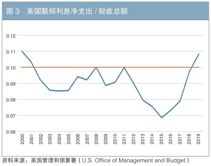 自2015 年以来,利息净支出/ 税收总额的值随债务规模扩大而上升, 并在2019 年达到10.8%(见图3)。而穆迪将主权债务评级从Aaa下调到Aa 的警戒线通常是10%,美国已经触及该警戒线。未来随着债务规模继续扩大,即使利率维持在低位,利息净支出/ 税收总额的值也会持续上升,直接影响着债务的可持续性。