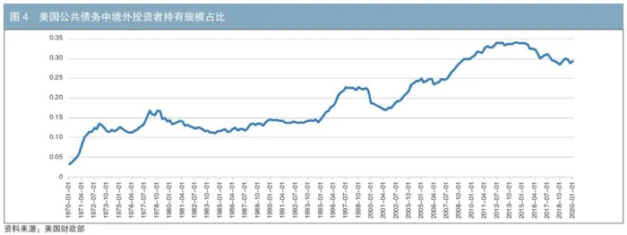 债务融资能力是在不需大幅提高融资成本的条件下,筹集大量债务的能力。在各类投资者中,境外投资者较不稳定,对其投资行为的预测难度也较大。对于美国公共债务的境外投资者而言,影响因素除了美债本身的情况外,还有美元汇率、美元地位、各国整体投资战略等。而美国公共债务的境外投资者持有比重一向很大,虽然近几年与峰值34% 相比有所下降,但在2020 年仍达到近30%(见图4)。这意味着外国投资者动向对美债融资趋势起着举足轻重的作用。