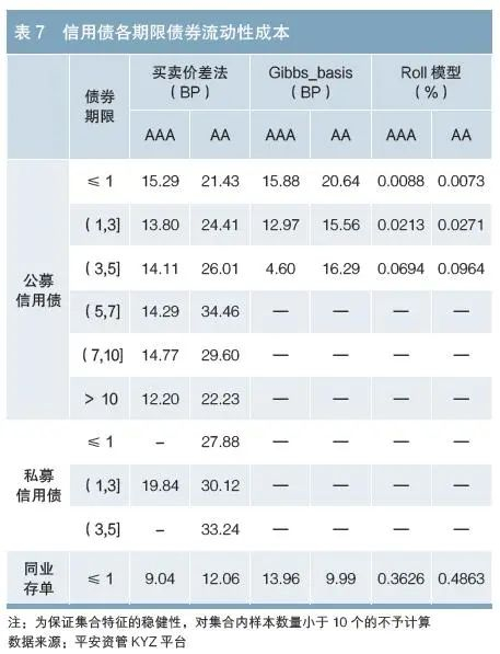 二是信用债。由于信用债的成交活跃度较低,根据成交数据计算的Gibbs_basis 和Roll 模型下流动性成本均存在不同程度的失真。买卖价差整体反映出信用债期限与流动性成本呈正相关关系,期限越长的信用债流动性成本越高,但1 年期以下的AAA 级信用债流动性成本较高,而7年期以上的AA 级信用债流动性成本有所下降(见表7)。