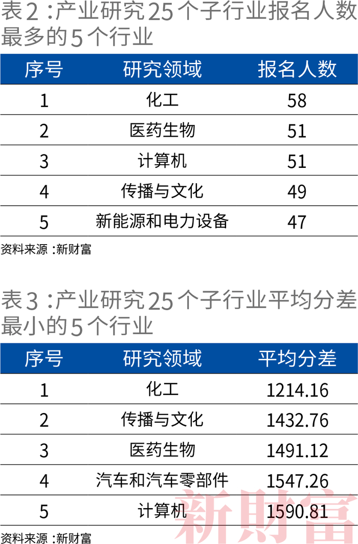对产业研究的25个子行业报名人数进行统计,化工行业人数最多,医药生物和计算机其次,传播与文化、新能源和电力设备行业排在第四、第五(表2)。而产业研究的25个子行业中平均分差最小,也就是竞争最激烈的板块,基本落在了以上行业。分差最小的是化工行业,其次为传播与文化、医药生物、汽车和汽车零部件以及计算机行业(表3)。