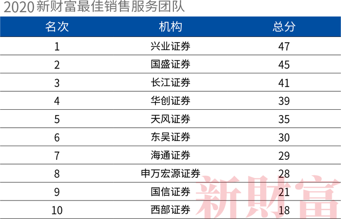 同时,在“最佳销售服务团队”评选中,兴业证券销售服务团队夺得第一,这是其自2014年以来第7次夺此冠军。国盛证券、长江证券、华创证券、天风证券分列第二至第五名。
