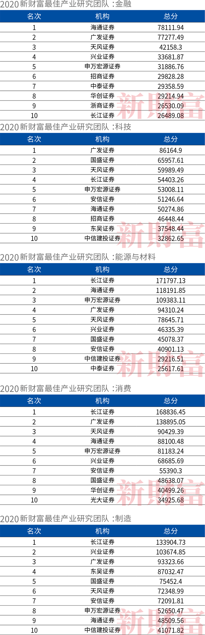 长江证券延续2019年的强势,本届评选继续包揽消费、制造、能源与材料三大产业研究方向的第一名。海通证券、广发证券分别获得金融、科技产业研究的第一名。