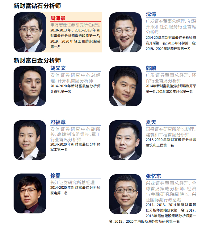 本届评选新产生了一位“新财富钻石分析师”——申万宏源证券周海晨,他在2010-2013年、2015-2018年夺得造纸印刷第一名,并于2017年获颁“白金分析师”称号,2019、2020年他继续夺得轻工和纺织服装第一名,累计获10届第一名,成新财富最佳分析师评选史上继国盛证券杨涛之后第二位满足“钻石”标准的分析师。