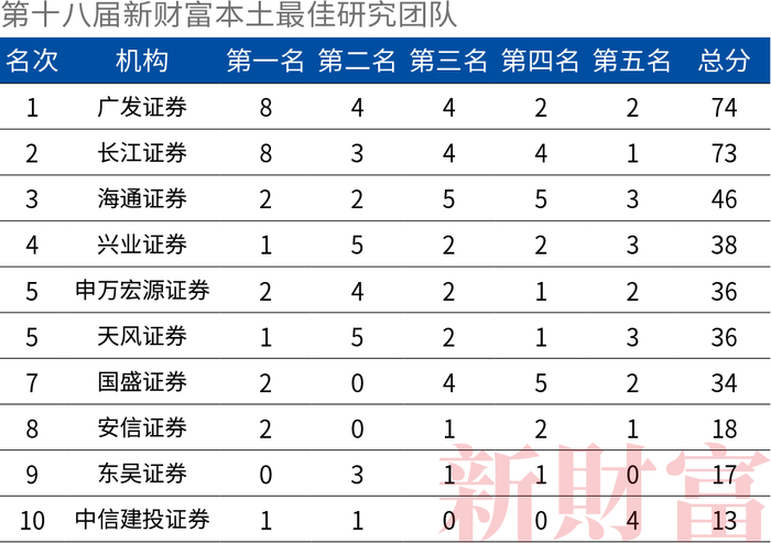 广发证券本届评选共获得8个研究领域的第一名、4个第二名、4个第三名、2个第四名、2个第五名,总分达到74分。