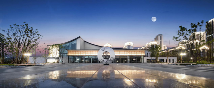 建筑主色调是黑白灰,简洁的建筑外立面搭配粉墙黛瓦、马头墙、坡屋顶等古朴建筑特色,通过粉墙黛瓦、彩绘门楣、院落天井等打造“山水之居”,处处体现楚风汉韵的中国民居元素。