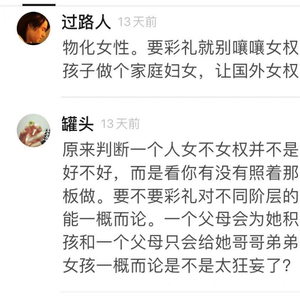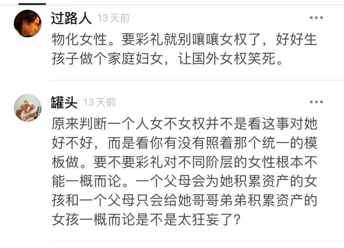 “要彩礼这个行为不也是受父权的影响吗?难道双方不能因为爱情结婚一起创造未来吗?那些坚持男性必须出彩礼的人是源于什么呢?那些坚持女权的人,不觉得收彩礼才更是被侮辱吗?这算卖女儿吗?算给女性标价吗?算不算利用女性的性别优势在玩双标呢?”