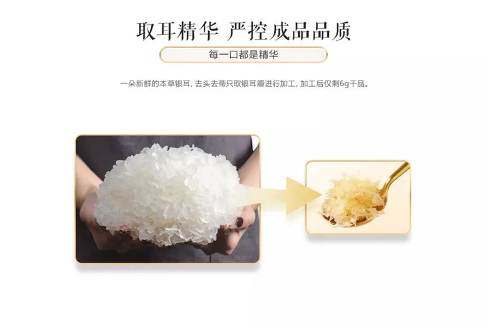 别看它一小袋只有6g,其实都是100g的新鲜银耳精华浓缩而成的哟~