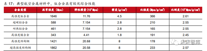 钛合金综合性能位居航空金属材料之首,是军机性能提升的必然之选。一方面,军机发展 呈现“轻量化”趋势,即结构重量系数不断减少,相比于结构钢,在强度相当情况下,钛 合金的密度较小,仅相当于结构钢的 56.25%;另一方面,随着军机飞行速度不断提升, 飞行高速飞行过程中机身表面的温度不断提升,对机身材料的耐高温性要求不断提高,铝 合金、镁合金等使用温度普遍在 300℃以下,而钛合金的工作温度可达到 500-600℃。因 此以美国军机为例,从三代机 F-16 到四代机 F-22,军机机身钛合金用量从 2%上升到了 41%,钛合取代了铝合金成为 F-22 机身的主力材料。