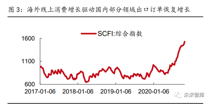 国内消费逐步复苏,海外对中国消费品出口依赖加大。2020 年 3 月以来,我国率先走出 新冠疫情影响,三季度国内社零开始恢复增长且涨幅不断提升。海外来看,疫情的持续蔓 延驱动了消费的迅速线上化,从而带来了国内优势出口商品尤其是电子产品的需求激增。另外,2020Q2 以来,上海出口集装箱运价综合指数(SCFI)持续抬升,截止 2020 年 10 月 30 日,SCFI 综合指数已达到 1529.99,创 2011 年以来最高历史纪录。在内外需双轮 刺激下,国内部分制造业恢复景气度,从而抬高企业扩产意愿并驱动相关设备投资力度加 大。