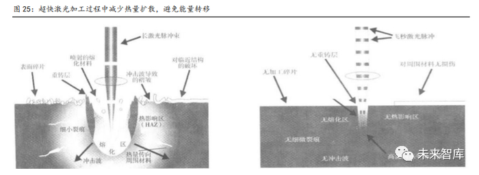 (1)硬脆性材料:硬脆性材料指的是坚硬且脆性的非金属材料,主要包括蓝宝石、高强 度玻璃以及陶瓷。此类材料硬度较高,受热时容易膨胀而碎裂,不适用于普通激光切割和 焊接,对“冷加工”要求较高。比如,手机正面的玻璃“全面屏”以及后背板上的蓝宝石 摄像头保护层都对超快激光的“冷加工”有较强需求。