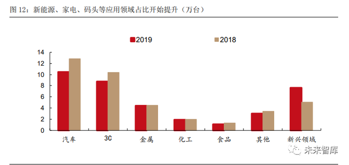 新能源、码头等新兴领域为行业带来新增量。根据 IFR 发布的 2019 年全球工业机器人数 据来看,工业机器人在汽车和 3C 两大领域应用占比分别下降 5.0pct 和 8.2pct,“新兴领 域”占比则从 13.0%提升至 20.3%。这其中主要包括新能源、家电、码头搬运等应用领域。根据我们的产业链调研,海外头部品牌对新兴领域尚未涉足,国产工业机器人在这些领域 更有机会突破。