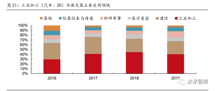 工业加工为主要应用,科研军事占比提升。从下游应用领域来看,包含汽车和 3C 在内的 工业加工为最主要的应用方向,2019 年工业加工占整体市场比重达 40.6%,相较上年下 降 4.4pct。2020 年汽车和消费电子市场有所回暖,我们预计工业加工占比会有一定程度 的回升。科研军事在 2019 年占比从上年的 7%提升至 12%,一方面,随着技术的进步, 激光加工(尤其是超快激光)在航天发动机等军工领域将持续渗透;另一方面,2020 年 国际局势不稳定因素多发,军费投入占比持续提升,因此我们预计未来激光设备在科研军 事领域的应用占比将进一步提高。
