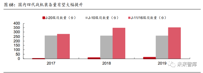 中国军机将迎来结构性以及数量上的双重升级。根据 World Air Force 数据,美军三、四 代机型累计服役量已经达到 94.90%,我国现役 2、3 代机型累计服役量达到 81.30%,军 机迭代速度远低于美国。第三代战机歼-10/11/16 仍为装备服役主力机型;四代战机歼-20 刚开始列装,在役数量仅为 15 台;除战斗机外,运-20 作为我国中长期科技的优先发展 项目,自 2016 年列装,2019 年服役量达到 71 台,预计近期 20 系军机会迎来量产,推 动相关企业业绩进入拐点。
