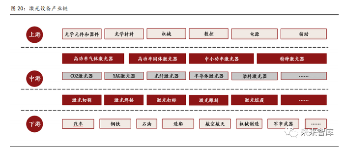 激光器位于产业链中游,占激光设备成本30%-50%。激光器是激光加工设备最核心的零 部件,约占激光设备成本 30%-50%,直接决定了激光设备的性能以及功率高低。激光器 按照放大介质的不同可分为光纤激光器、固体激光器、气体激光器和染料激光器等种类。激光器处于激光产业链的中游,上游包括光学元器件、材料以及数控程序等。下游应用领 域则包含汽车、3C、军工、医疗、通信、轨交以及科研等多个领域。