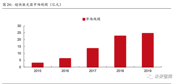 超快激光器是近年来激光器市场最突出的增长点。超快激光器是指脉冲宽度在皮秒及飞秒 级别的脉冲激光器。超快激光器在加工时缩短了激光作用时间,减少了热扩散并避免了能 量转移,提高加工效率的同时也保护了周围的材料结构,实现真正意义上的“冷加工”, 因此近几年超快激光器发展迅速。根据 2020 年中国激光产业发展报告,2019 年国内超快 激光器市场规模达到 24.5 亿元,已占到光纤激光器市场的 1/3。2015-2019 年间复合增长 率达 70.5%,远高于激光器市场整体的增速。