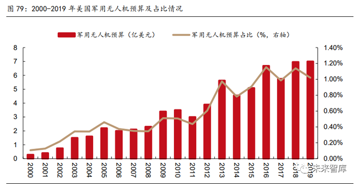 无人机未来趋势明显,中国已位列发展头部。根据瑞典斯德哥尔摩国际和平研究所数据, 2010-2019 年,全球近 60 个国家分别从美国、以色列、中国等进口 1200 架以上无人机 装备军队,中东地区进口 362 台,占比 30.1%。另一方面,在无人化、信息化战争理念下, 相应先进技术将进一步扩大无人机的应用范围。以美国为例,自 2000 年起,美国国防部 公布在建立联合无人空战系统目标下,美国 2000-2019 年对军用无人机相关的投资预算从 0.28 亿美元上升至 7 亿美元,年复合增速 18.4%。