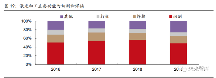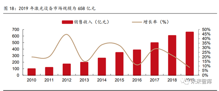 激光(LASER)是受激辐射放大的英文首字母缩写,即通过人工的方式使用光或放电等强 能量激发特定物质产生的光。激光加工的原理则是利用激光产生的高能量快速融化材料的 加工处,从而实现激光设备的切割、焊接、打标、雕刻、熔覆等功能。2019 年全国激光 设备市场规模达 658 亿元,同比增长 8.8%,其中切割、焊接、打标分别占工业激光器应 用比例 49%、17%、8%。