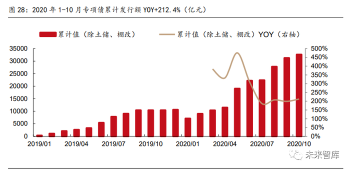 资金面:2021 年专项债有望持续提振基建需求。从专项债情况来看,2020 年 1-10 月累 计发行 35,878 亿元,YOY+64.9%;去除棚改和土储项目后,YOY+212.4%。从资金面来 看,1-10 月基建相关专项债的同比高增有望继续驱动 2021 年上半年基建需求持续增长。