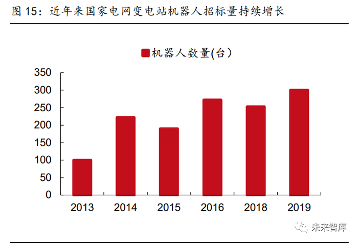 机器人应用场景拓宽,服务型机器人崛起。机器人技术和供应链的日趋成熟驱动了机器人 的应用领域不断从工业领域向服务型渗透。协作机器人是指可在协作区域内与人直接进行 交互的机器人,能够在复杂、危险作业中协助人工,提高工作效率、降低安全隐患。根据 GGII 统计,2019 年国内协作机器人产量达到 5,068 台,同比增长 47.2%。另一方面,电 网类的服务机器人开始快速渗透。自 2013 年开始,国家电网开始组织变电站巡检机器人 招标,并分配给各省网公司进行推广普及,招标次数也从 2015、2016 年的一年一次提升 到目前的一年两次以上,成交总金额达到 2.5 亿元/年以上。