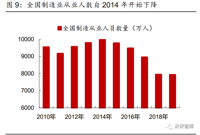 人力成本持续提高,“机器换人”将是长期趋势。人力成本方面,国内制造业平均薪酬从 2010 年的 30,916 元/年涨至 2019 年的 78,147 元/年,制造业对于人力成本高度敏感;另 一方面,随着外卖、快递以及其他第三产业的兴起,制造业人员流失严重,国内制造业从 业人员数量从 2014 年的 9,977 万人降至 2019 年的 7,929 万人。“用人贵、招人难”是我 国制造业当下的痛点,我们认为,在国内制造业景气度上行、人力成本大幅上涨的矛盾下, “机器换人”将是未来几年的长期趋势。