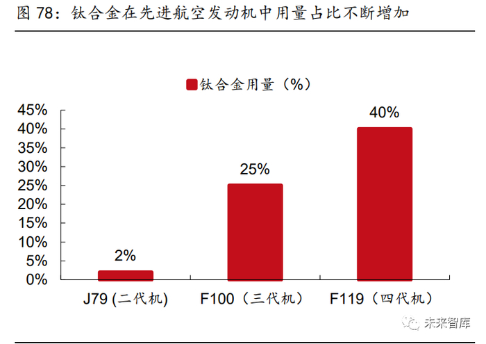 钛合金成为航空发动机冷端主力材料,在先进航空发动机中用量占比不断增大。先进航空 发动机的发展趋势是推重比不断提高,一方面通过提升燃气温度增大推力,另一方面,通 过采用轻质材料以减少整体重量,由于钛合金综合了相对低密度以及相对较高的耐高温性 能,航空发动机性能的提升也带动了钛合金用量的提升。以美国三代典型航空发动机为例, 从列装于二代机的 J79 发动机到列装于四代机的 F119 发动机,钛合金用量从 2%上升至 40%,几乎占领发动机冷端部位的全部应用。