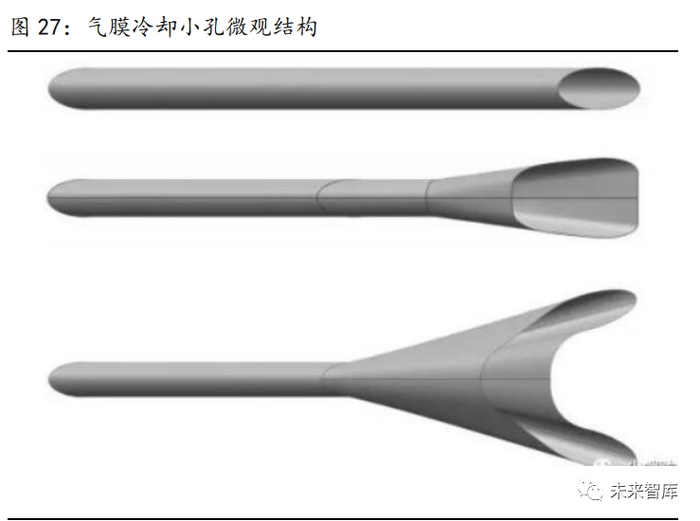 (3)航空航天“气膜冷却”:航天发动机的涡轮叶片需要在 1700℃的高温环境下工作, 但一般高温合金的熔点在 1500℃左右,因此需要在涡轮叶片上采取一定方式的降温处理。气膜冷却是比较常用的冷却技术,其原理是在涡轮叶片的不同部位打出形状各异的小孔 (小孔多为斜孔,角度在 15-90 度不等),通过将高压冷空气从小孔注入涡轮叶片内侧, 在叶片表面形成一层低温气膜,隔离涡轮发动机内腔的高温,从而实现降温的目的。由于 涡轮叶片上的小孔密集且形状各异,叶片材质本身又较难加工,因此超快激光的“冷加工” 便有了用武之地。随着国产飞机和发动机的不断发展,超快激光在气膜冷却技术上的应用 将日益广泛。