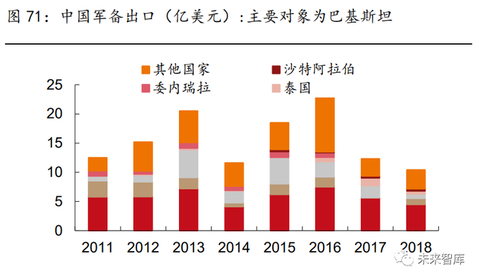 伴随新型军备定性落地,提升我国军备及配套零部件出口能力,引发出口替代。从主要出 口流向情况来看,目前中国主要军备出口方向为东南亚地区。以巴基斯坦为代表的进口国 的需求稳定。中东国家如沙特阿拉伯是军备进口大国,边境冲突不断,同时缺乏自制大型 武器能力,只能通过购买来提升军力。中国企业过去十年在中东地区的投资项目种类繁多, 中国已成为阿拉伯等中东国家第二大贸易伙伴,双边贸易额达到 2300 亿美元,预计 2020 年有望突破 5000 亿美元,伴随“中沙”合作规划,中东作为全球军火贸易重点,有机会 成为中国军事贸易走出去的潜在对象。