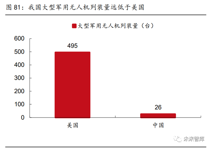 作为主战装备辅助器材,无人机有望大幅列装。目前全球仅美国、以色列、中国等少数国 家具有大规模生产军用无人机的能力,随着全球市场对军用无人机需求的增长,我国军用 无人机外贸市场需求有望进一步增长。另一方面,目前,我国无人机列装数相较于美国较 少,以大型无人机为例,根据国际战略研究所(IISS)数据显示,2019 年为止,我国大 型军用无人机列装量为 26 台,而美国则高达 495 台,为我国列装量的近 20 倍。无人机 作为现代化军队必备军备品,新型产品不断发展有望拉动我国无人机需求的快速增长。
