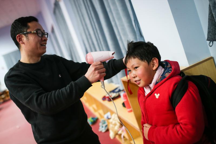 教练尹玉伟给训练后的孩子吹干头发,以免出去着凉。