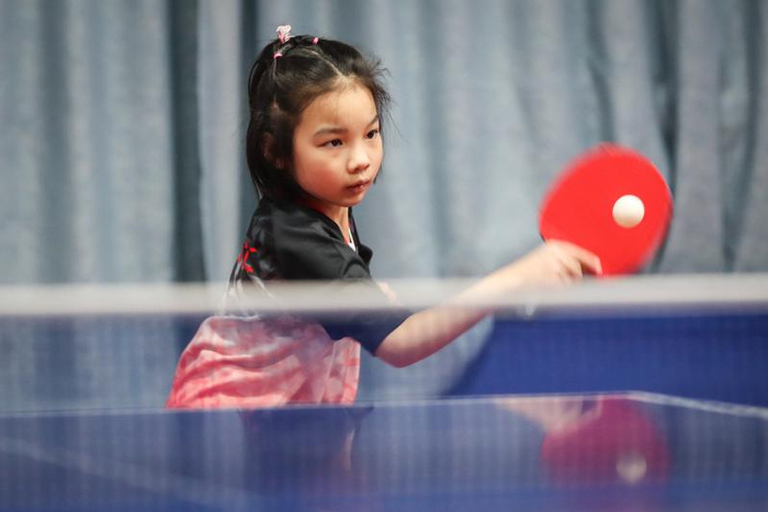 球台前,三个孩子的表现各不相同。大女儿按部就班、中规中矩;二女儿前后移动、步法灵活;小儿子聚精会神,打得有板有眼。