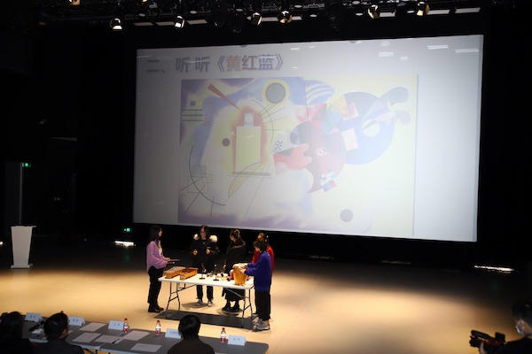 在16日的《艺术概论与鉴赏》课程成果发表会上,学生们以各自的方式分享了他们对作品的理解。其中,一组学生以蒙德里安的《黄红蓝》为主题,通过事先采访、现场演讲和演奏等,探讨了抽象绘画元素与音乐元素的共通性。“我们选择西岸美术馆来进行这门课程的发表,一大原因是因为‘时间的形态’的可跨越度比较广,”华东师范大学艺术教育专业舞蹈教师刘冉对澎湃新闻记者说道,“例如康定斯基的许多作品都与音乐、舞蹈相联系。所以学生们到美术馆来,虽然只是看到了美术作品,但是能够触发其他的艺术通感能力,这也是我们课程的目标,我们希望这个课程不只是传授单一的学科知识。”