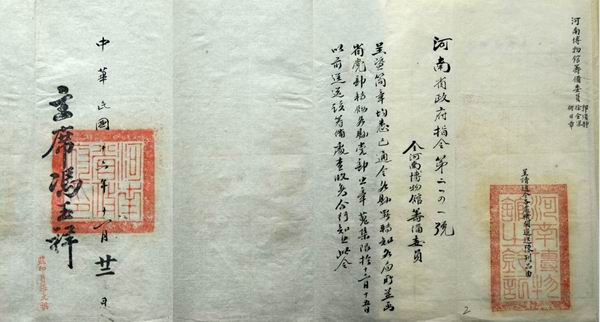 “查博物馆之设置,东西各国视为切要。因与一般民众之开拓见闻,增进智识綦有关系,非徒事陈设富丽侈为美观已也。河南夙称声明文物之区,开化最早,其天然之物产以及历代图史典籍之留遗品类,至为繁夥。或为公家予以不完全之保管,或为私人所珍藏,若无一定处所收罗陈列,以为大雅鸿博之钜观,殊于保存国粹,开拓民智,均未臻完善办法,况革命军此次会师入豫,本政府从新建设一切军事政治工作,纪念尤为宝贵,应即设馆,广为陈列,俾人游观以激发国民革命之精神。惟该馆既系创设规模宜取宏大,地址宜求适当,应如何筹备设置,必须指定专员负责办理,以便早观厥成。查该厅主管事项与博物有种种关系,为此令仰该厅长即便遵照,迅将创设河南博物馆各事宜,赶速妥为筹画(划)负责办理,以壮观瞻……”