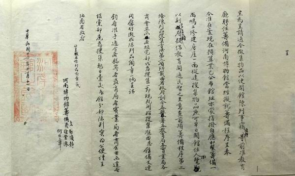 “呈为呈请通令征集物品以便开馆陈列事。窃须静等前准教育厅聘任筹备河南博物馆,当经拟就筹备程序,呈奉令准在案。现在预算业已公布,馆址亦蒙指拨,自应加紧筹备。一面鸠工修建房屋,一面从事搜集物品,庶可早日开馆,任人浏览,以副钧府提倡教育开通民智之至意。查前项筹备程序第二条,陈列品搜集方法第二项所载,由省政府训令各县署、各教育局、各实业局、各商会并函各级党部代为搜集一节,现既开始搜集应由属馆备文连同应行征求陈列品简章一纸呈请。钧府准予通令各县署、各教育局、各实业局、各商会并函达各级党部,广为搜集,尅日汇交属馆分部陈列,实为公便。谨呈”