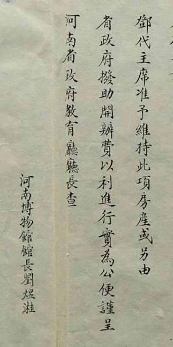 由此文中“筹备时期行将届满”可知,1928年3月份行将届满,具休筹备工作何时结束,各项工作进展到何种程度,我们现在不得而知。但据1928年5月刘煜溎以河南博物馆馆长名义向省政府的递送呈文可知,1928年4月河南博物馆筹备期结束,省政府令刘煜溎为河南博物馆馆长并接收馆务。