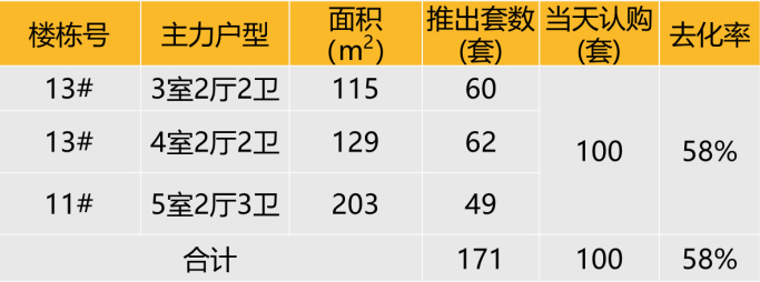 认购去化:2020年12月19日本项目推出171套房源,开盘当天认购100套,去化率58%。