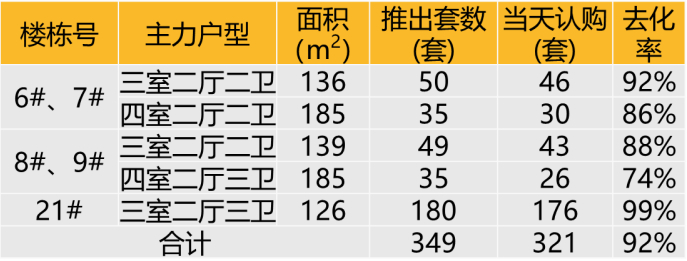 认购去化:2020年12月19日本项目共推349套房源,开盘当天认购321套,去化率92% 。