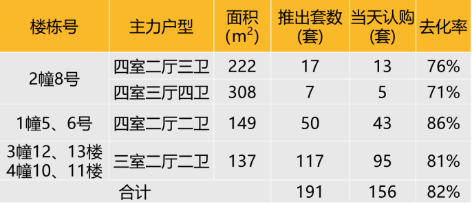 认购去化:2020年12月24日本项目共推191套房源,开盘当天认购156套,去化率82%。