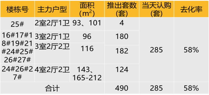 认购去化:2020年12月27日本项目推出490套房源,开盘当天认购285套,去化率58%。