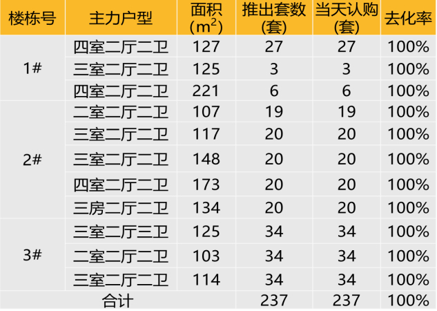 认购去化:2021年1月9日本项目共推出237套房源,开盘当天认购237套,去化率100% 。