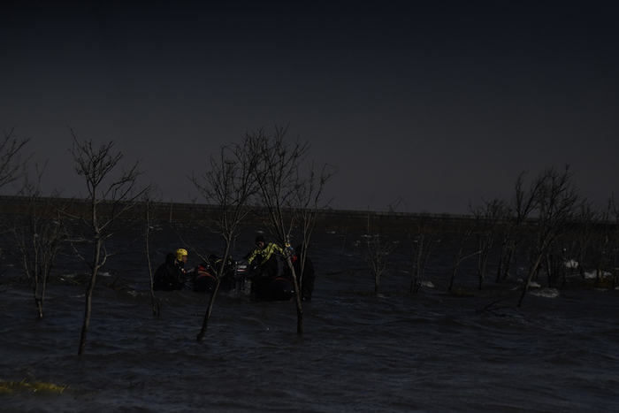 “我们往海里开,前方有什么一概未知,看不见浪有多高,只能听到海风与浪拍打船只的声音。”方舟回忆,长达4.5米的橡皮艇,开一段就被推回岸边,现场虽有便携式照明灯具与照明车,但与整体的黑暗相比显得作用甚微。