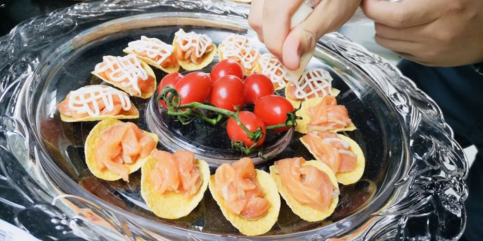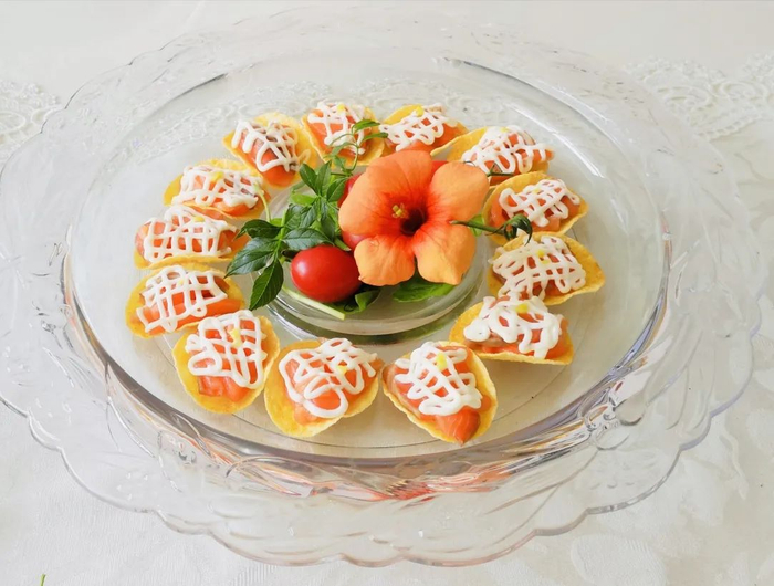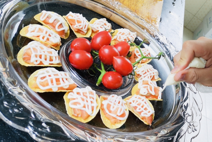 三文鱼、沙拉酱、薯片、青芥、小番茄