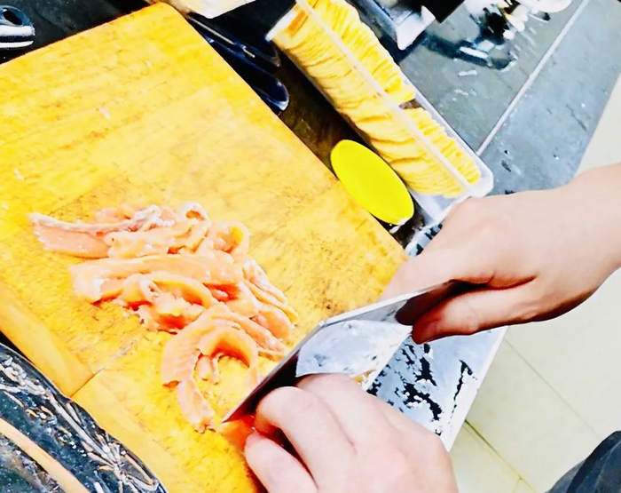 2.将沙拉酱装入保鲜袋的一角,在保鲜的一角处剪小口,即可挤出细长的沙拉条。建议用“之”字形手法,沙拉成网纹状便可均匀覆盖住三文鱼。