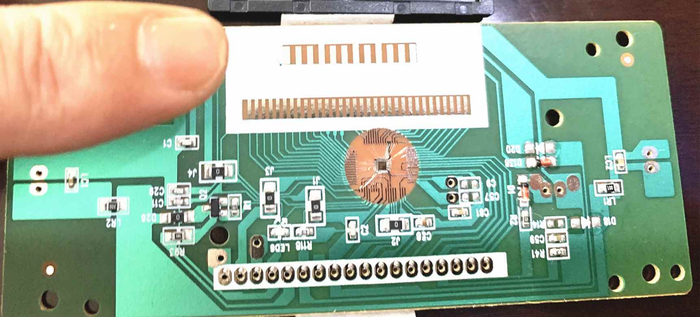 电话机厂家拿到芯片和线路图之后,就可以根据自己的外壳和显示屏进行排板,采用邦定(wire bonding)和表面贴装(SMT)工艺生产出电话机控制板。金线的中央的黑色小方块就是电话芯片的裸片(die),邦定之后要整体封胶保护。