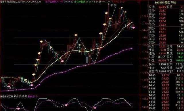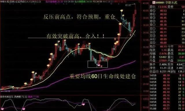 其实这里想强调的是第2波的买点。这是最好的一波,其买点也相对比较明确,就是图中的60日线买点。当价格在第1波筑顶后回调,跌破颈线,在一片恐慌中,来到了60日线。此时,是最佳买点。如600801华新水泥筑了个M头,: