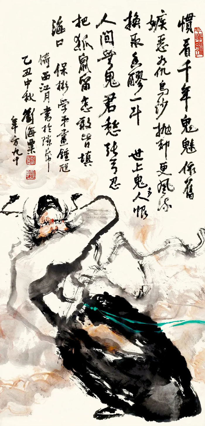 一代美术巨匠刘海粟嘉许他画能载道,为其钟馗画题词:“惯看千年鬼魅,依旧嫉恶如仇,乌纱抛却尽风流,换取香醪一斗。世上鬼多人恨,人间无鬼君愁,张弓忍把狐鼠留,怎敢皆填海口。”