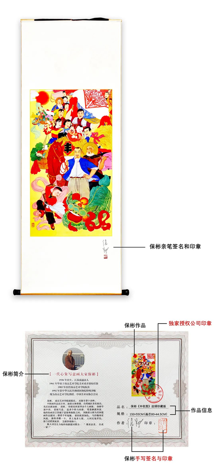 每一幅丝绢珍藏版《丰收图》防伪保真,有保彬亲笔签名,盖保彬姓名章。