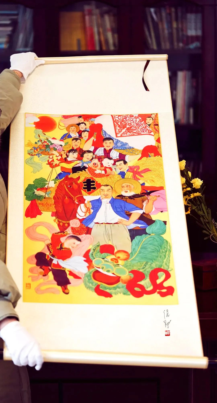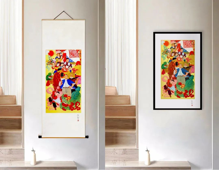 丝绢卷轴版《丰收图》为全装裱设计,可直接卷轴悬挂,也可自行装框悬挂(产品不含画框,请自行装配)。无论是中式装修、还是西式装修,无论是客厅,还是卧室、书房、茶室、玄关、办公室,这幅《丰收图》都呈现出强烈的视觉冲击力,萦绕着福气、好运、喜庆吉祥、年味十足。